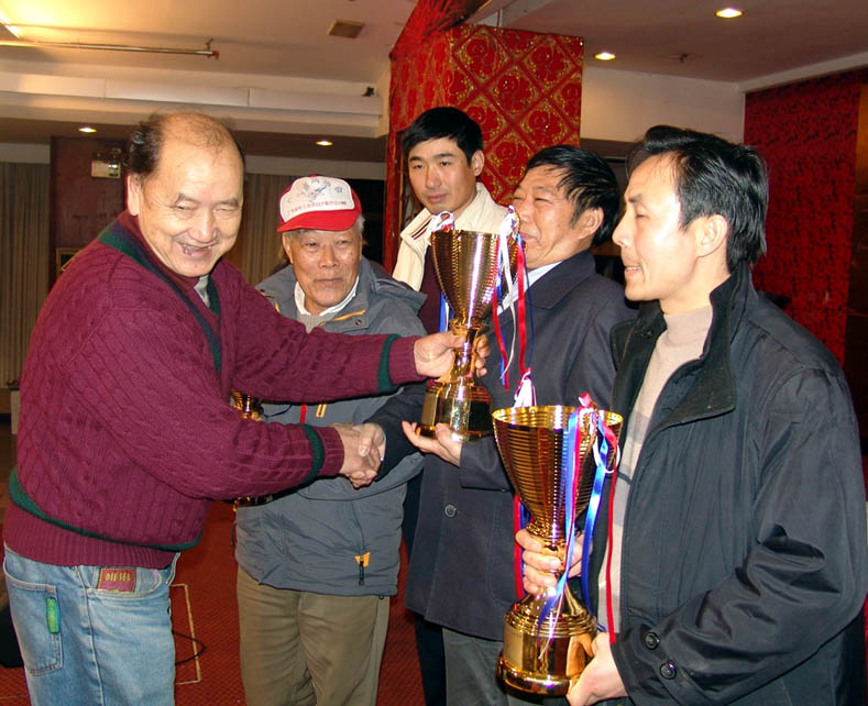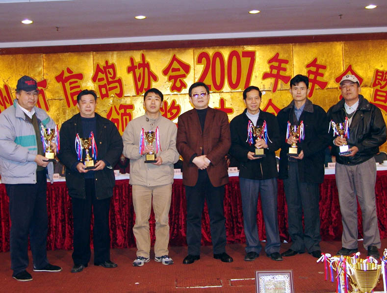 省鸽协副主席陈善钊(左四)为获得广州第一届CEGDF鸽王赛的8名“鸽王”颁发精美的水晶奖杯,这是广州市首次有文字记载、由官方举办,且组织严密、难度较大的一次比赛,当时有199只选手鸽参与角逐,最后只有8只戴上了“鸽王”这顶桂冠:林建喜(冠军)、李文民(2、6名)、杨 乔(3名)、李良浩(4)名、卫剑辉(5名)、浩和(7名)、成根林(8名)。