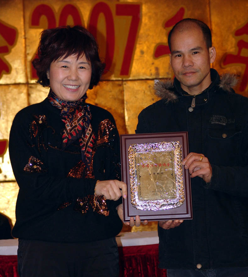 朱穗风为获得广东省幼鸽环赛、市特比环赛的优胜者颁奖
