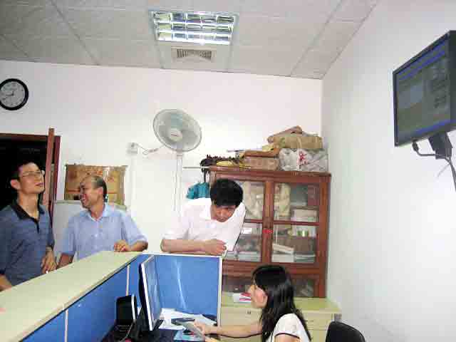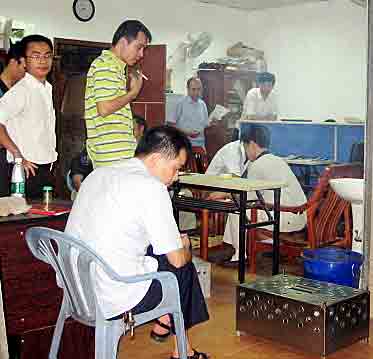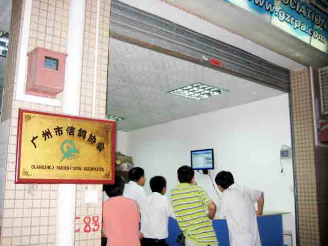 2008年6月20日,广州鸽协抓住长时间大雨初停,立即组织奥运年首场比赛:江西南康-广州。由于前一阶段鸽子训放丢失特别严重,加上省组织的国家赛和当地其他竞翔组织“迎难而上”,几乎全军覆没,广州今年首场比赛参加比赛鸽子约300羽左右,不少大户强豪也只能参加一两羽“过把瘾”。鸽子2008年6月20日早6点放出,天气是近几个月内比较理想的,万里无云,但是沿路温度比较高,进入到广东境内最高温度达到36度,给鸽子快速归巢带来困难。当时,鸽子从南康放出后,司放裁判就判定大约在中午11时左右冠军就可以报到,可是在他们开车返回时,天气的炎热使他们没有早上放鸽时的乐观。等在信鸽协会办公室的副主席王锦康和报到裁判员何容佳,9:30就已经上岗严正以待,可是时针走到了中午12点,还没有一羽鸽子报到......12:10分左右,电话铃突然响起,王副主席一接电话果然是冠军报到了,广州罗家军的一羽灰母于12点05分打下鸽钟......时钟走到12点35分,番禺长城兄弟鸽舍林刚强报进,他于12:32分打下鸽钟;时间到了1点55分,汤次林的第三羽鸽子报到。后来每隔20-30分钟返巢一羽,截止当天报到有效期内,这次比赛共归巢23羽,归巢率不足一成,冠、亚军鸽的分速八百多公尺。但是,广东“夏季放鸽难”是众所周知的,秋季放700、1000公里的优胜鸽,往往在夏季300公里就“拜拜”了,而且分速很少超过400公尺......所以,今年的成绩与归巢率均超过了历史最好水平!图为会员到鸽会情景。(广广)