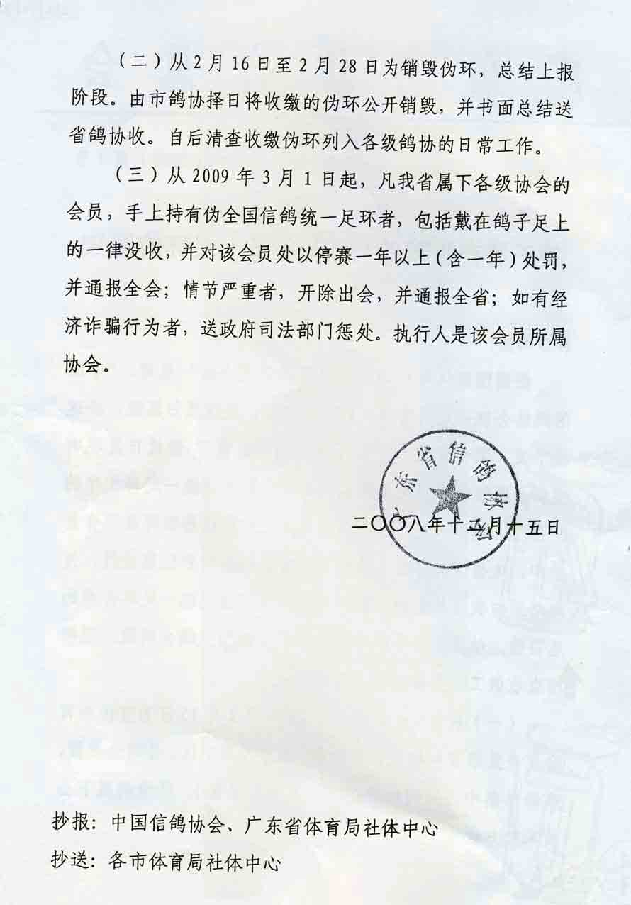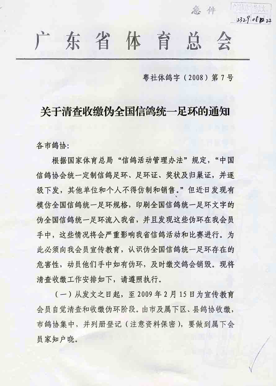 广东省发出清查收缴伪全国信鸽统一足环的通知