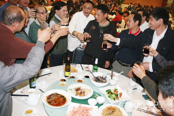 广州市体育局副局长廖小明到每张餐桌上给信鸽会员进酒