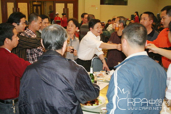广州鸽协秘书长罗斌正在给参会会员和信鸽获奖者敬酒表示祝贺