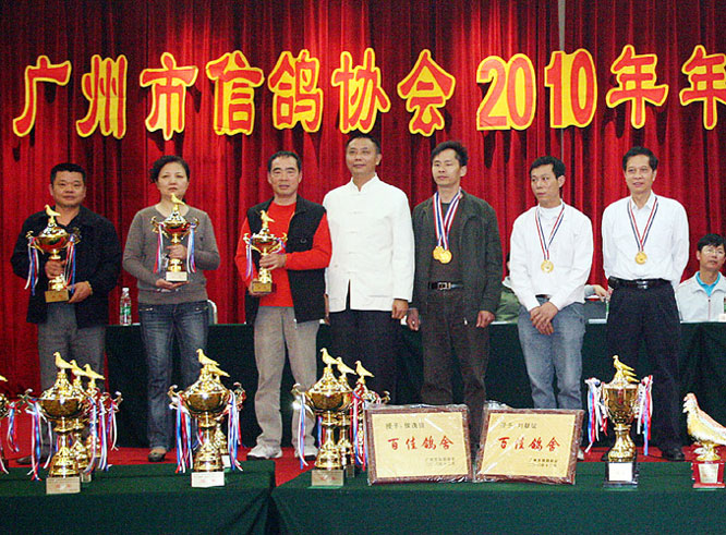2011年3月3日晚,广州市信鸽协会在红帆渔港召开2010年年会暨颁奖大会.广州市体育局副局长廖小明到会作重要讲话,并为大会颁奖。图为廖小明副局长为获得广州市“浩羽杯”第3届信鸽锦标赛优胜者颁奖。左1:冠军罗碧华、左2:亚军罗斌(夫人朱幼华代),左3:第3名梁树佳,中:廖小明副局长,右3:4、5名林建喜,右2:第6名陈武和,右1:第8名郑伙强。(广广)