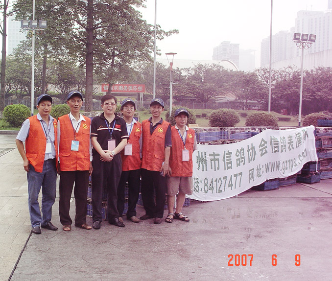2007年6月9日,广州市第十四届运动会暨全民健身月启动仪式及第三届体育节在天河体育中心隆重开幕,广州市信鸽协会秘书长罗斌亲自带领信鸽表演队参加表演.左一:麦振炳,左二:劳国才,左三:何志明,右三:罗斌,右二:林建国