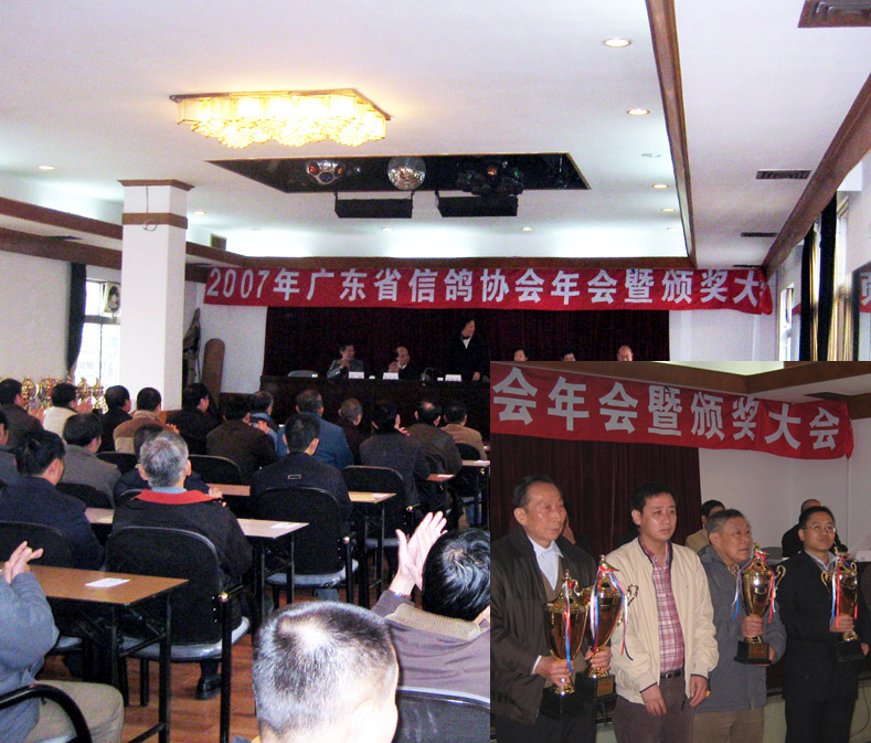 2008年1月27日15点,广东省信鸽协会年度颁奖大会在广东省体育总会五楼会议室隆重举行。原广东省委副书记、人大主任,现任全国侨办副主任到会并讲了话。颁奖大会之前,省属18个市级信鸽协会的负责同志对2007年度的竞翔工作,及2008年的全省竞翔计划进行了广泛的会议讨论。2007年全省大部分各市鸽会都飞出了较好成绩,部分鸽会还刷新了本地区的竞翔记录,广州市鸽协700Km当天归巢130多羽,刷新了当地历年当天归巢羽数记录。